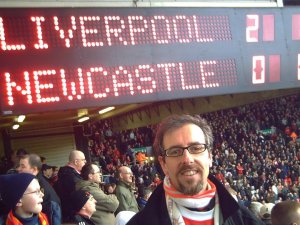 Así que en 2008, el día de mi cumpleaños, mi sobrina, a sabiendas que yo atravesaba un bache amoroso (¡Pax y las mujeres…!), se presentó en mi cumpleaños con un jueguecito de adivinanzas, que yo creía que culminaba con una camiseta del Liverpool de regalo, ¡y ya me parecía la leche! Pues no. Mi sobrina Nuria había juntado a toda la familia y a mis amigos para, entre todos, mandarme al Mersey. ¡Un Liverpool- Newcastle! Entrenado por Keegan, el que fuera mi jugador favorito.
